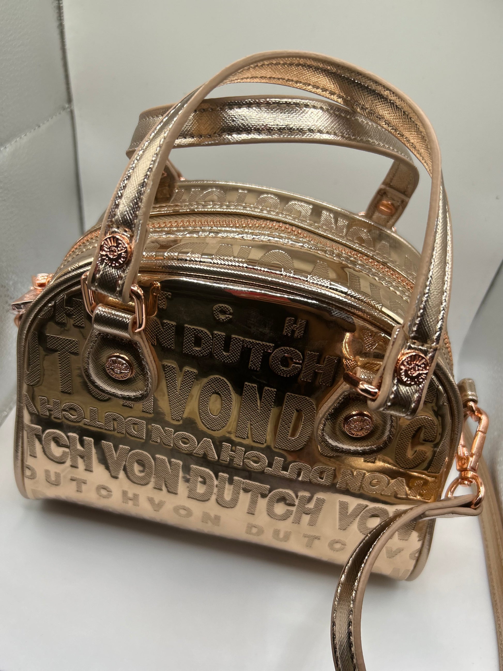 Genuine Von Dutch Rose Gold Metallic Bowling Bag Purse – Celebrity-Approved Style